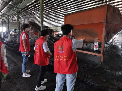 活动当天,实践团不仅通过调查问卷的发放及与当地村民的深入交流了解情况,还采访了三洼村村委会副主任陈兆香,考察了村里养鸡场粪便处理情况。通过走访调研,实践团了解到当地农村各类作物秸秆及人、畜粪便产生量日益增大,而搜集处理能力不足,造成农村固体废物乱堆、乱倒,污染环境的问题日益严重,而且盐城是农业大巿,畜禽粪便对生态环影响也较为突出。为此,实践团特走进江苏绿方圆生物科技有限公司了解并学习畜禽粪便转化为有机肥的具体过程。来到厂区经过好氧发酵处理的禽畜粪便堆得像小山丘一样,却没有想象中的臭气熏天,公司技术人员介绍说道:“我们开发的超高温菌技术拥有25项专利,充分利用农村畜禽粪便、病死畜禽等废弃物,加工出生态有机肥。”团队成员在他的带领下走进处理间,进一步了解了生态有机肥的制作方法。