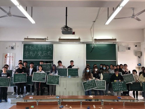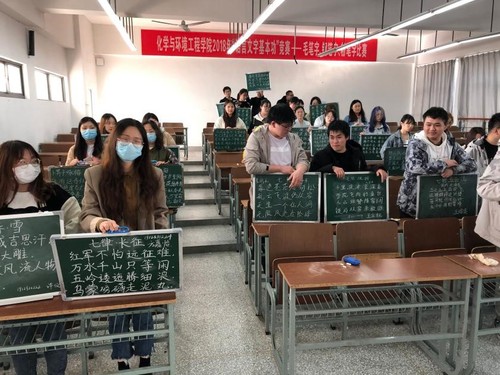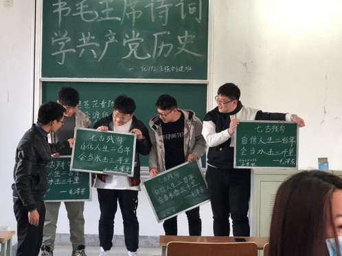 为提高师范生教学基本功、加强课堂教学书写艺术性和板书设计美感,4月28日,化20(1)S王强创建班,化19(2)S王强创建班于生化教学楼314、315教室组织开展了粉笔字板书比赛,书写内容以毛主席不同时期的革命诗词为主。