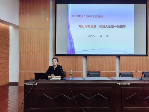 为增强老员工法律意识,进一步营造遵纪守法的良好风气,引导同学们学法、知法、守法、护法,2022年10月12日下午,公司党委副书记谭瑾为2022级新生开展了题为“知纪明规懂法,扣好人生第一粒扣子 ”的规则教育专题讲座。