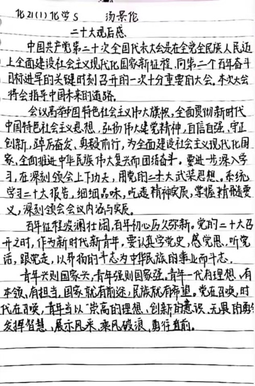今天我观看了二十大的开幕式。观看了以后我最大的心得就是激动。这次党的全国代表大会完全不同于以往的基调,给我的最大感触就是我们的国家,我们的人民正在朝着正确的、幸福的、伟大的道路行进中!“人无精神则不立,国无精神则不强。唯有精神上站得住、站得稳,一个民族才能在历史洪流中屹立不倒、挺立潮头。”翻开风云激荡的红色篇章,沿着中国革命、建设、改革实践的时间轴,中国共产党人的精神谱系灿若繁星,融汇成一脉相承、绵延不绝的精神史诗。——化20(4)邹妮啦