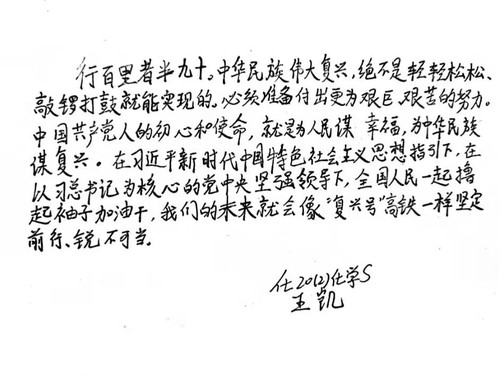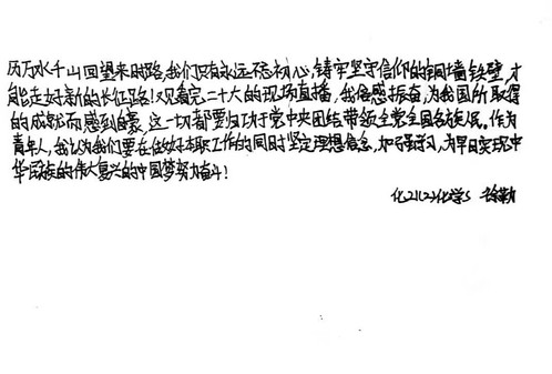 举国上下都在迎接二十大的召开,二十大为后五年制定了详细的目标。国家的希望在于青年,民族的未来在于青年。五星红旗迎风飘扬时,我心潮澎湃。很荣幸能够生于此,长于此,我爱我的祖国。我们新时代青年将更加努力学习科学文化知识,坚定理想信念,用赤诚之心奉献我的祖国。以青春之我创建青春之国家。——化21(4)刘依红