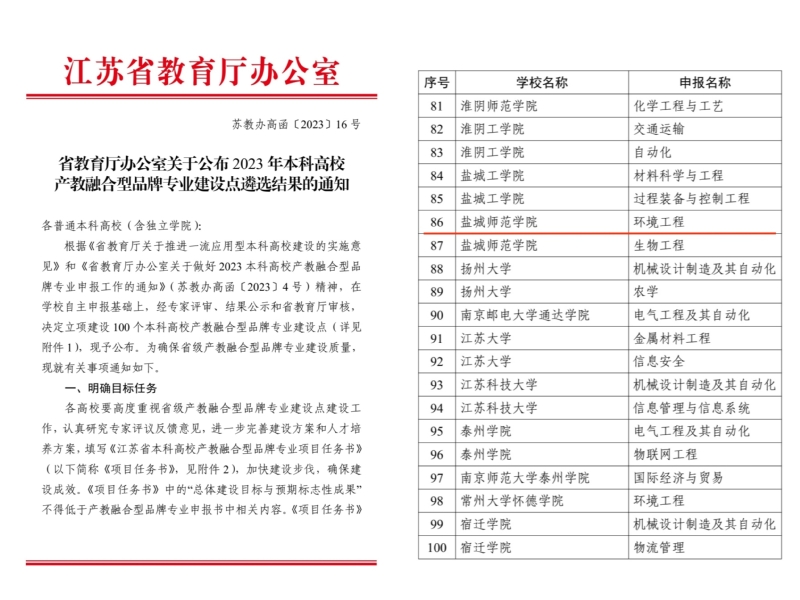 近日,省教育厅发布《关于公布2023年本科高校产教融合型品牌专业建设点遴选结果的通知》,公司环境工程专业获批2023年江苏省产教融合型品牌专业建设点,是继应用化学专业获批省级卓越工程师教育培养计划2.0专业建设点后,公司专业建设取得的又一个标志性成果。