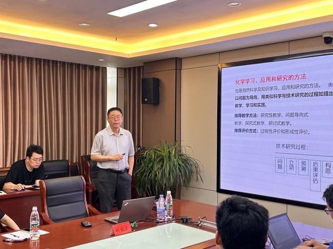 胡效亚教授首先从国家政策与高等教育发展的背景展开分析,指出了高校青年教师教学能力欠缺所包含的社会责任感、实践能力、创新能力等三大问题,提出了以问题为导向,用类似科学与技术研究的过程如提出问题、观察分析、假设、推理、检验等来进行教学、学习和实践。胡教授结合自己《产教融合分析化学教学案例——锂离子电池硅碳负极材料研发中的分析化学问题》,鼓励每一位化学教师都应参与企业的研发工作,且在研发过程中要具备批判性思维,对一切难点都能提问和怀疑,包括权威。报告会后,胡教授对师范专业认证及审核评估分享了自己的心得体会,对化学及化学教育发展趋势进行了研判,并对教学成果奖申报进行了指导。