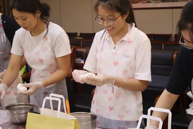会议伊始,谭瑾老师向所有参会的同学表示亲切慰问与关心,并致以节日的问候,希望来自不同省份的45名少数民族员工在公司感受到家的温暖。随后,新生代表逐一介绍了自己民族的特色风俗及入校以来的感受,大家纷纷表示盐城是一个打开心扉的城市,盐师也是一所温暖的大学。座谈会现场气氛活跃,与会同学踊跃发言,党委书记刘洋对同学们提出的相关问题做出说明和解释,并激励同学们进入大学要尽快适应和转变,树立自信、自立、自强的观念,关注自我成长发展,确立目标不断奋进,实现由内而外的蜕变。随后,在专业甜品师傅的指导下,同学们一同参与月饼制作,从揉面、包馅到压模,每一个步骤都充满欢声笑语,大家共同感受着传统节日的氛围。