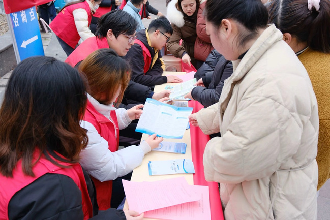 在钱江社区广场上,员工志愿者协助钱江社区网格员围绕居民关心的养老保险参保、医保异地报销、灵活就业补贴等高频问题,通过发放社保宣传册、现场答疑等方式逐一解答。