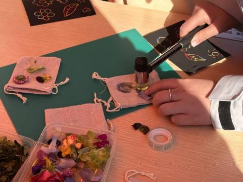 最后的“植物拓染”活动将传统手工艺与春日自然完美融合。同学们精心挑选自己喜欢的植物,轻轻放置在帆布袋上,随后拿起锤子,有节奏地轻轻敲打。随着敲打,植物的汁液慢慢渗出,纹理也逐渐清晰地印在布料上。