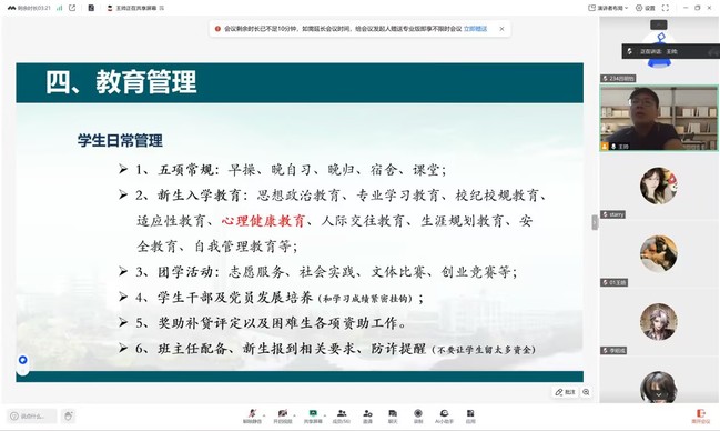 心理健康与调适教育活动以“心向阳光,赋能成长——迎接大学心理新状态”为主题,给予新生们心灵上的呵护。公司第一时间获取新生问卷调查的反馈数据,认真分析后,重点关注有潜在心理困扰的新生,辅导员们通过一对一线上沟通,给予他们关心和鼓励。“xx天身体健康营”线上打卡活动也深受欢迎,新生们每天坚持运动、分享健康饮食、记录作息。这些活动让新生养成了良好生活习惯,也以乐观心态迎接老员工活的挑战。